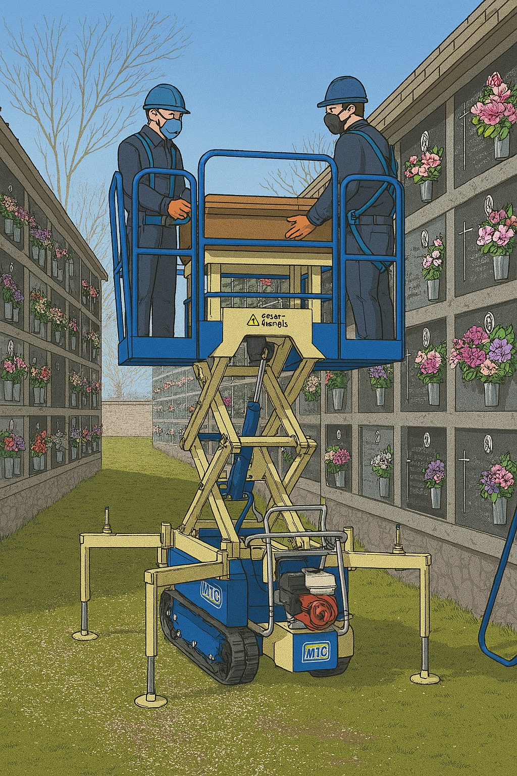 El modelo incorpora un motor eléctrico con dirección asistida por timón y estabilizadores que aseguran una correcta nivelación durante la operación de elevación. Además, el producto adquirido por los responsables municipales incorpora bandeja corredera, lo que facilita y mucho el trabajo de introducción del ataúd en el nicho.