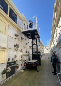 Este equipo ha sido diseñado específicamente para el transporte de féretros y materiales dentro de recintos funerarios, permitiendo una movilidad ágil, segura y respetuosa con el entorno. Su tamaño compacto facilita el acceso a pasillos estrechos y zonas de difícil maniobra, optimizando los desplazamientos diarios del personal.